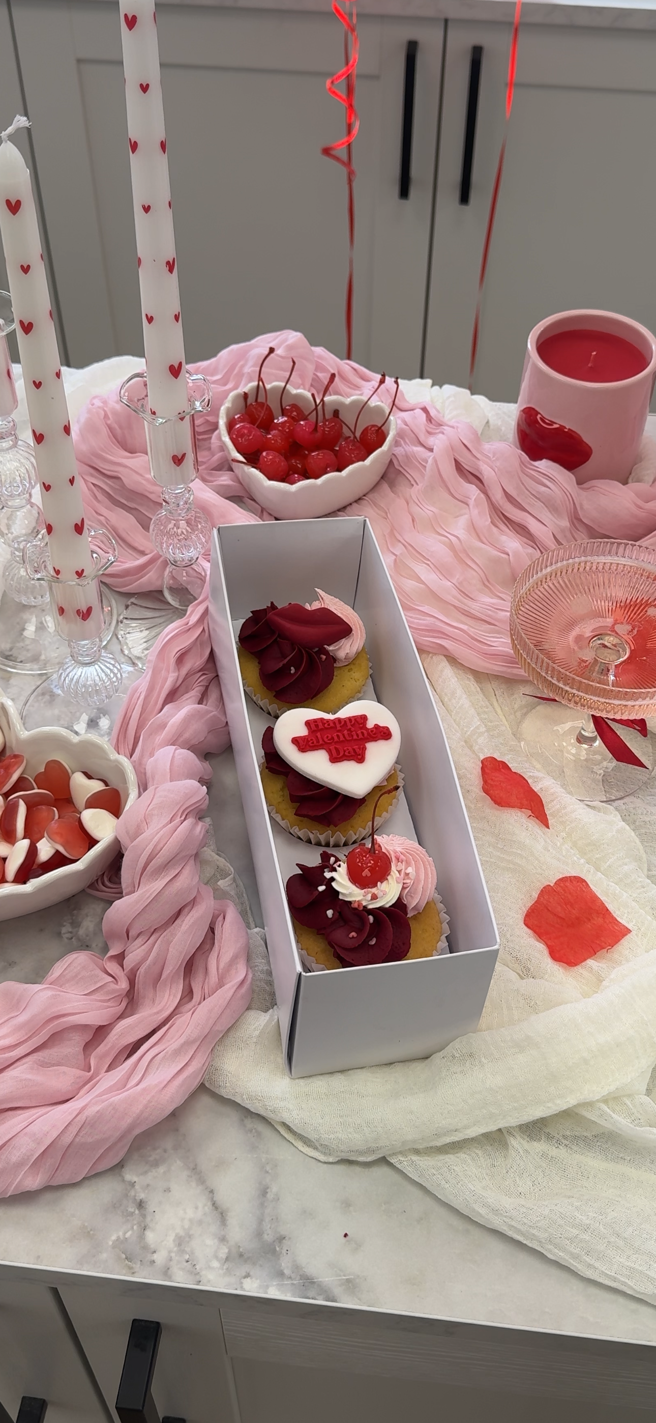 Our Valentine’s Cupcake Trio features three classic cupcakes topped with silky buttercream swirls in romantic tones, finished with delicate details and a fondant heart stamped with either Happy Valentines Day or Love You. Presented in a sleek gift box, they’re perfect for sharing, gifting, or adding a little love to your Valentine’s celebrations. 💗