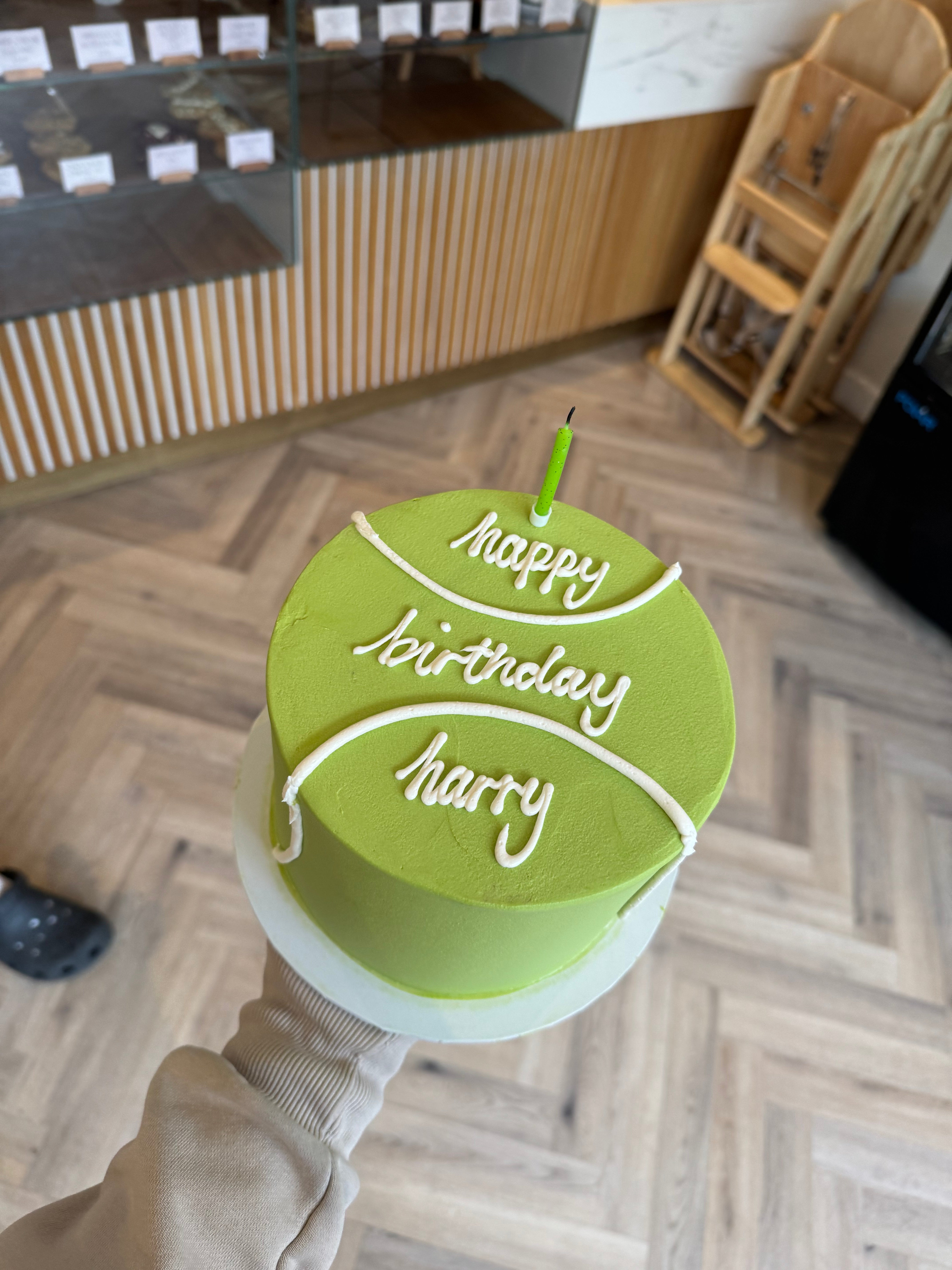 Game, set, match — and cake! Our Tennis Ball Short Cake is frosted in vibrant green buttercream and finished with signature white piped tennis ball lines for a playful, sporty look. Perfect for tennis lovers, birthdays, or post-match celebrations.