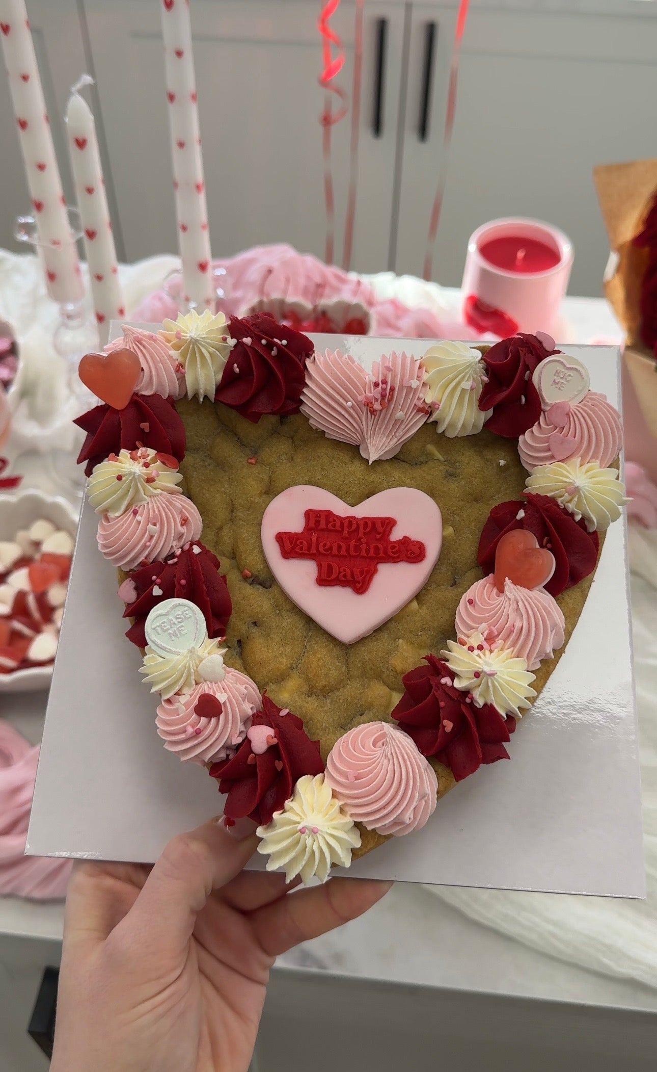 A soft-baked, heart-shaped chocolate chip cookie decorated with piped buttercream, Valentine’s sprinkles, and finished with either a fondant stamped disc or a hand-piped message.
