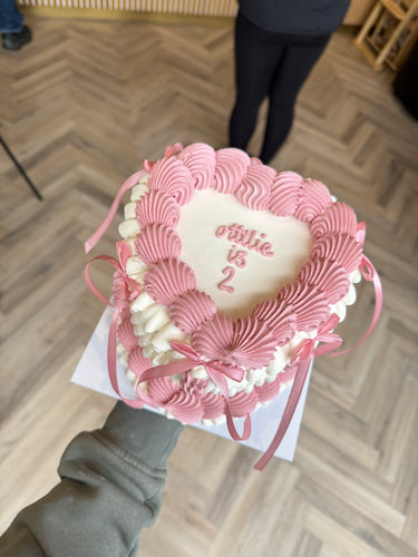 Elegant and timeless with a touch of vintage charm. Our Dusky Pink & White Vintage Bows Heart Cake features smooth white buttercream, piped detailing, and delicate dusky pink bows for a beautifully feminine finish. Perfect for birthdays, bridal showers, or any occasion that calls for something classic and pretty.