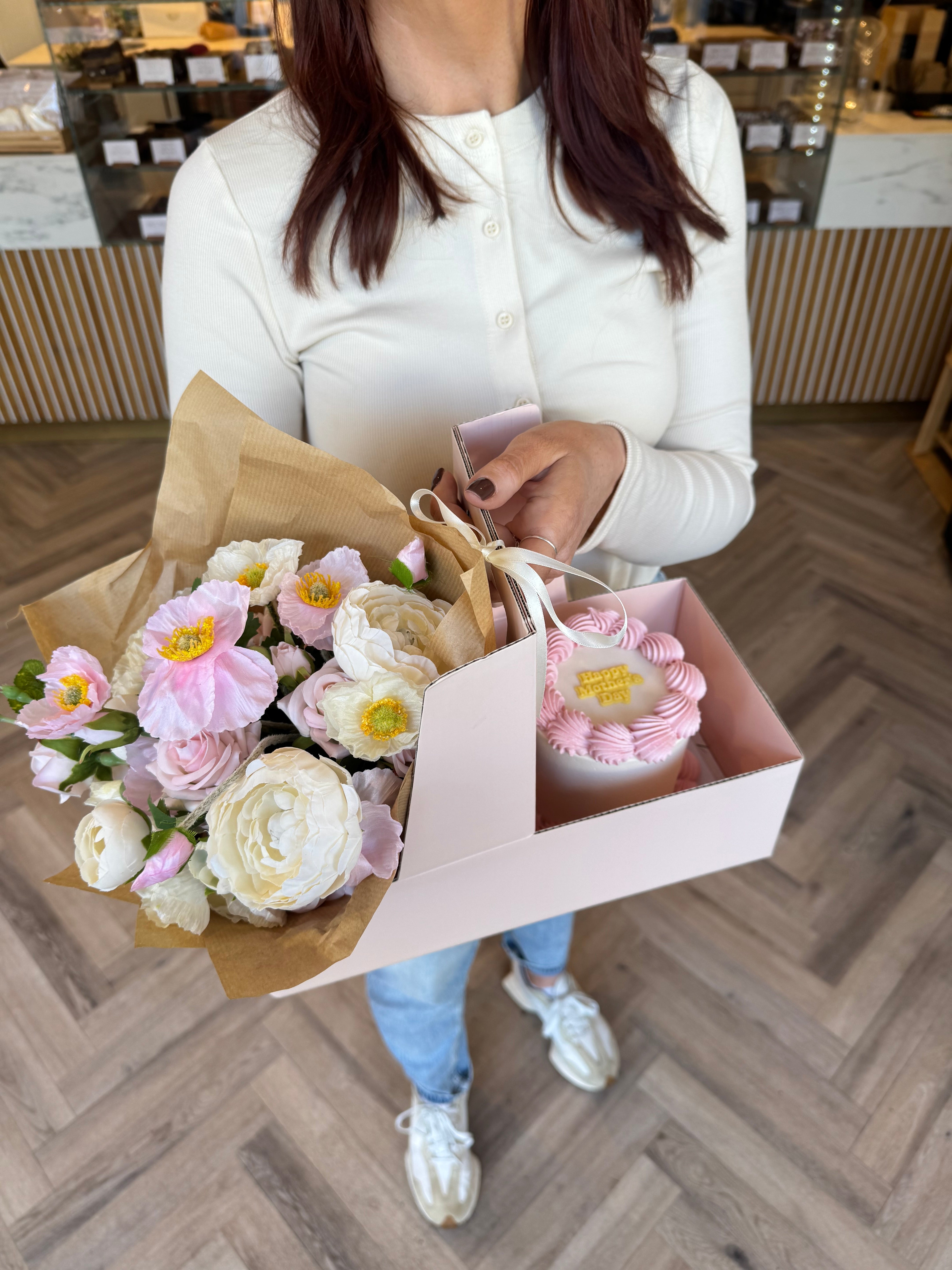 Our elegant pink presentation box includes a beautifully decorated mini cake finished with soft pink piping and a “Happy Mother’s Day” topper, paired with a stunning arrangement of faux flowers for a gift that lasts beyond the last slice.