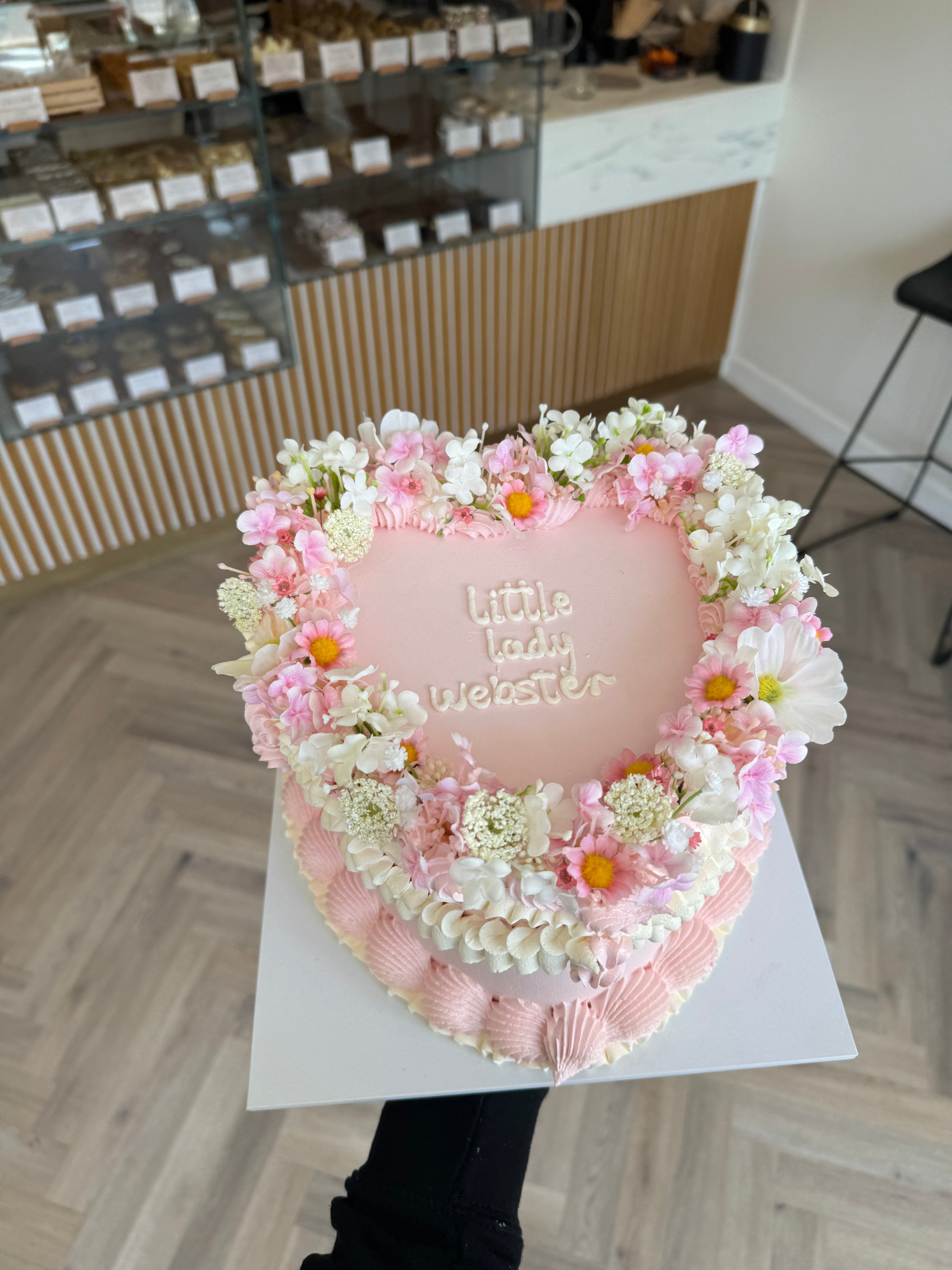 Pretty, delicate, and full of floral charm. Our Pink Floral Halo Heart Cake features a soft pink buttercream base surrounded by flowers in complementing tones — creating a romantic, elegant finish that’s perfect for birthdays, anniversaries, or any special celebration.