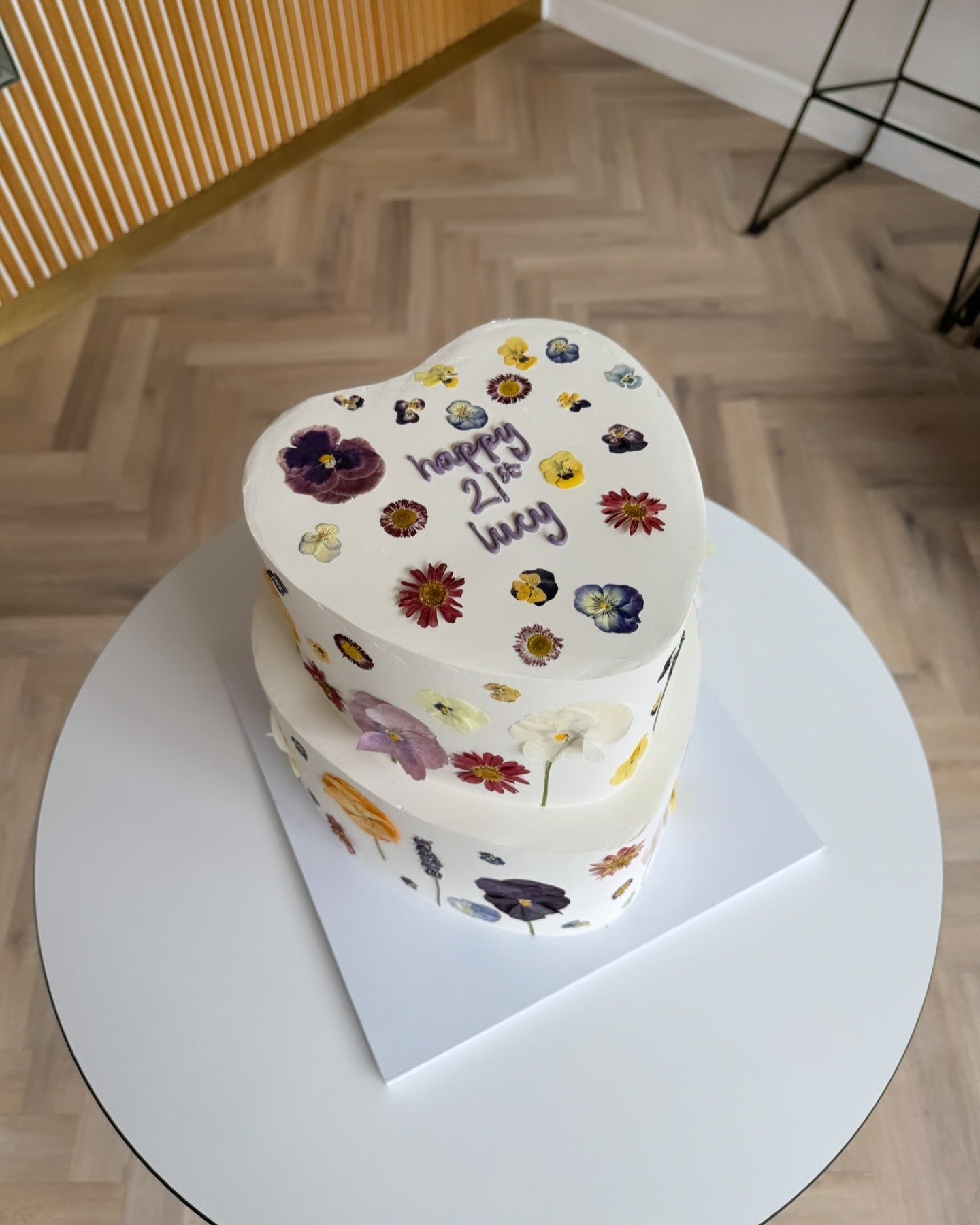 Our Edible Pressed Flower Cake features a smooth buttercream finish adorned with real pressed edible flowers, carefully placed for a soft, organic look. Light, elegant, and effortlessly refined, it’s perfect for birthdays, garden celebrations, or anyone who loves a fresh, nature-inspired design.